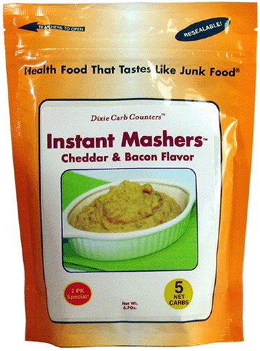 Dixie Carb Counters Instant Mashers. Two pack. Each 2-pack has 8 servings of low carb mashed potato substitute. Mix each packet with 1 cup water, 2 Tablespoons butter and 4 Tablespoons of cream. Stovetop and microwave instructions on package. Nutrition Facts: Serving Size 1/2 cup (23.8g dry), Servings Per Container 8 (4 per packet), Calories 96, Calories from Fat 21, Total Fat 2g, Saturated Fat 1g, Trans Fat 0g, Cholesterol 9mg, Sodium 218mg, Total Carbohydrate 11g*, Dietary Fiber 6g*, Sugars 1g, Sugar Alcohols 0g*, Protein 8g *Net Carbs as listed by the manufacturer on the package = 5g per serving.
